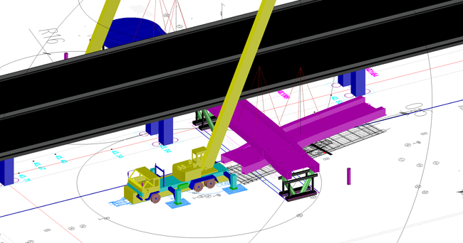 濟(jì)南百花公園過街天橋在主橋鋼箱梁吊裝中引入多項(xiàng)技術(shù)手段破解低凈空難題。項(xiàng)目前期部署環(huán)節(jié),項(xiàng)目部提前在場外劃定專用存梁區(qū),將兩幅鋼箱梁的全部拼裝焊接工作外移,降低現(xiàn)場作業(yè)對交通的影響,顯著減少現(xiàn)場吊裝工序風(fēng)險點(diǎn)。項(xiàng)目技術(shù)團(tuán)隊(duì)對現(xiàn)場工況進(jìn)行三維精細(xì)化建模,提前識別方案中兩處潛在碰撞風(fēng)險,及時優(yōu)化吊裝路徑。吊裝定位方面,針對低凈空作業(yè)中“看不見、測不準(zhǔn)”的痛點(diǎn),項(xiàng)目部提前對吊車支腿、運(yùn)梁車??奎c(diǎn)進(jìn)行精準(zhǔn)放樣、標(biāo)識,同時根據(jù)3D模擬得出的鋼絲繩理論角度,利用激光束進(jìn)行空間投射校核,將抽象的吊裝軌跡轉(zhuǎn)化為可視化的光束路徑,確保精準(zhǔn)吊裝。這套融合工序前置、數(shù)字模擬與可視化校核的解決方案,為后續(xù)同類低凈空工況施工提供了可復(fù)用的技術(shù)路徑。