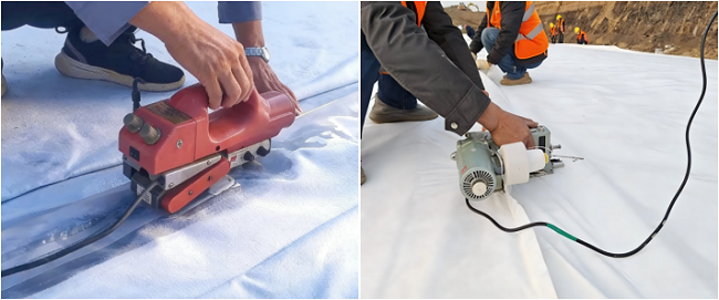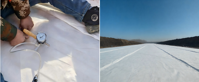 濟(jì)寧高新區(qū)城鄉(xiāng)供水一體化提升工程(一期)EPC總承包項(xiàng)目成功應(yīng)用復(fù)合土工膜熱熔焊接及縫合創(chuàng)新技術(shù)攻堅(jiān)水庫防滲施工難點(diǎn)。項(xiàng)目團(tuán)隊(duì)采用智能行走雙軌熱熔焊機(jī)雙焊縫同時焊接工藝,通過紅外測溫與實(shí)時反饋?zhàn)詣诱{(diào)控溫度,搭配寬主縫+窄副縫雙焊縫結(jié)構(gòu),實(shí)現(xiàn)焊縫均勻密實(shí)。針對構(gòu)筑物銜接、坡體轉(zhuǎn)角等難點(diǎn)部位,采用預(yù)留搭接、階梯焊接、分段焊接等專項(xiàng)工藝,確保復(fù)雜區(qū)域防滲無死角。同步升級真空+氣壓檢測體系,實(shí)現(xiàn)焊縫質(zhì)量全流程可追溯;針對容易產(chǎn)生滲漏的十字型交叉焊縫、T字型焊縫、焊縫修補(bǔ)位置、庫底陰陽角及水庫進(jìn)出水口,同步采用超聲波檢測技術(shù),實(shí)現(xiàn)重點(diǎn)部位雙重管控。在土工布縫合方面,創(chuàng)新雙針雙線+鎖邊加固工藝,并采用“先縫合后焊接”協(xié)同工序,避免穿刺滲漏與高溫?fù)p傷,提升整體結(jié)構(gòu)穩(wěn)定性。項(xiàng)目團(tuán)隊(duì)開展多項(xiàng)工藝優(yōu)化與技術(shù)創(chuàng)新,形成一套智能、高效、可靠的防滲施工體系,防滲可靠性、施工效率、工程耐久性均實(shí)現(xiàn)顯著提升,焊縫合格率大幅提高,施工成本有效降低。